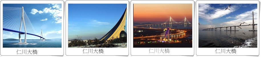 【仁川跨海大橋】2009年10月完工的仁川大橋市連接仁川國際機場、永宗島、松島國際都市的雙向6線道的雙層橋樑,全長21.38km,是韓國最大、最長的橋樑。仁川大橋有長達18.38km的部分是斜張橋結構,橋柱的間距越長越需要良好的技術力,其間距達800m,繼中國蘇通大橋(1,088m)、香港昂船洲大橋(1,018m), 日本多多羅大橋(890m)、法國諾曼地大橋(856m)後排名世界第5。象徵仁川大橋的橋柱高達238.5m,相於首爾‘63大廈’的高度,2005年12月8日曾被英國的專業建設週刊評選為"世界10大驚異建設"。仁川大橋的開通使得仁川與首爾南部等首都圈地區和仁川國際機場的來為時間縮短了40鐘以上,原本從仁川國際機場到松島國際都市需要1小時以上,現在只需要20分鐘左右。