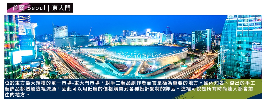 東大門綜合商場~此地聚集有百貨、食品、書籍、家電用品、…等生活必需品,為一整體性的批發市場,商品眾多豐富且價格優惠。在廣場的大帳棚內的「帳棚攤子」,有許多韓國的風味小吃,令人垂涎三尺,您可在此享用美食及享受購物樂趣。