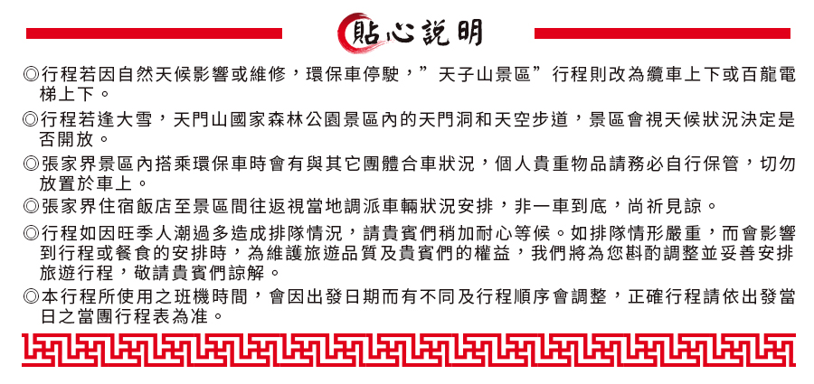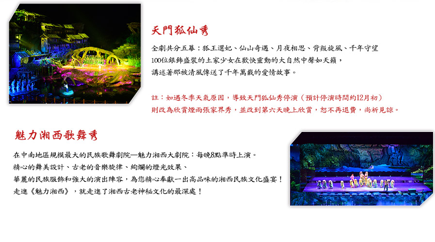 註:如遇冬季天氣原因,導至天門狐仙秀停演(預計停演時間約12月初),則改為欣賞煙雨張家界秀,並改到第六天晚上欣賞,恕不再退費,尚祈見諒。