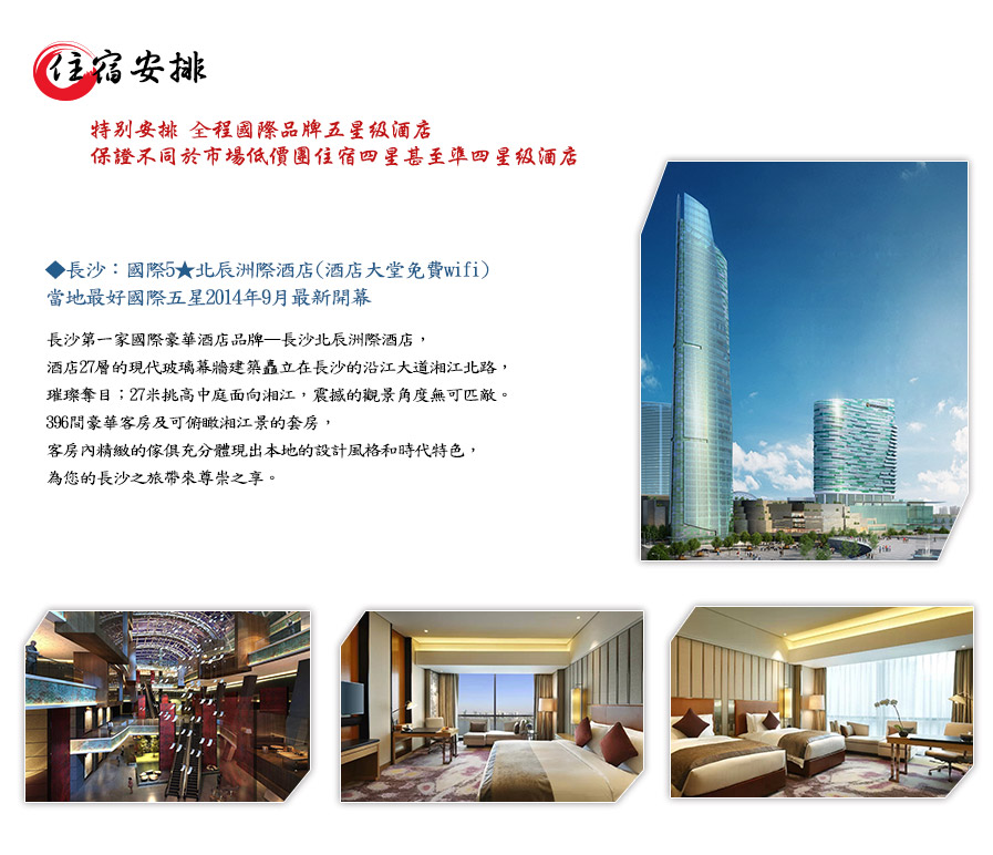 住宿:長沙:國際5★君悅酒店 或 凱賓斯基酒店 或 梅溪湖金茂豪華酒店 或 北辰洲際酒店或同級