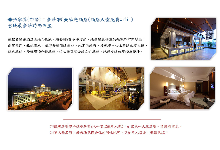 住宿:張家界市區:白金5★ 陽光酒店(8號樓)或同級