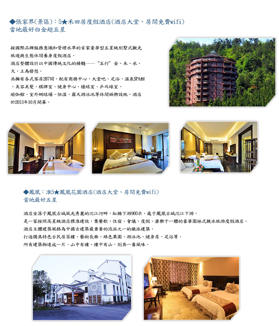 住宿:鳳凰:准5★鳳凰花園酒店 或 天下鳳凰8號樓 (當地最新)或同級