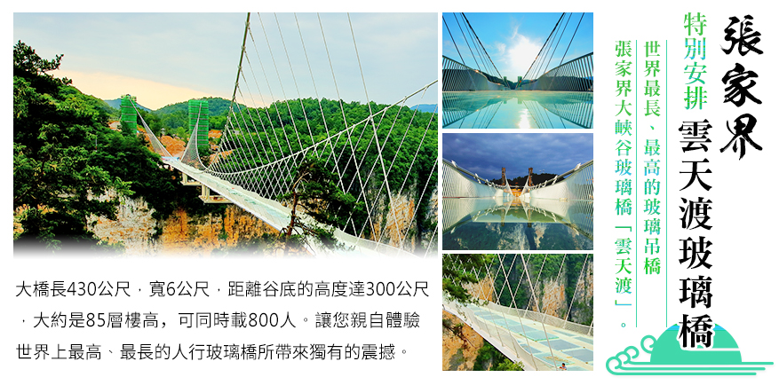 ★【景點參觀時間】: 袁家界百龍電梯『上』、迷魂台、天下第一橋(約3H) -天子山、賀龍公園、西海石林、天子山『纜車下』(約1H)-大峽谷『含玻璃橋+棧道+遊船』(約3H)