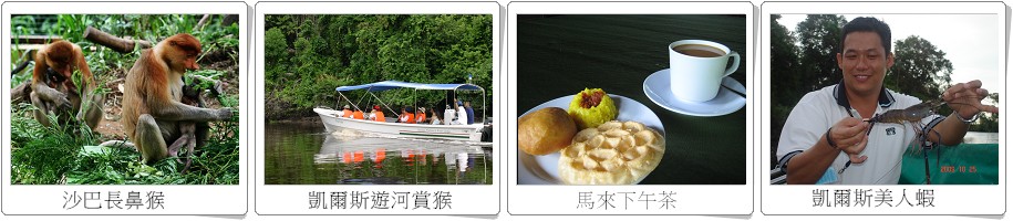 早餐後,跟著導遊展開沙巴的知性懷舊之旅。首先由獨立廣場開始,然後沙巴旅遊局〈途經〉、艾京生鐘樓〈遠望〉,遊專業的導遊為您開啟一探沙巴從二次大戰到脫離日本慘酷統治的那悲壯及可歌可泣的歷史,保證讓您馬上能感同身受。沿途充滿六零年代的建築,一定會讓您不由自主的停留下來,拿起相機捕捉沙巴懷舊街到那美妙的身影。逛累了,我們隨即安排各位前往一旁的富源茶餐廳,品嚐獨特美味加椰吐司在配上香濃的奶茶,稍微休息一下。隨後午餐特別安排風靡全馬來西亞的Morganfield’s新潮美式餐廳享用美味的烤肋骨套餐以及飲料無限暢飲,體驗一個非常美式的餐飲文化。餐後您可以在這亞庇最新最大商場Imago Shopping Mall享受逛街購物的樂趣,商場內包含各國名牌精品旗鑑店、世界各地美食…,應有盡有,保證讓您滿足度假額外的享受喔!隨後專車前往亞庇市南部之丹蘭鎮,途中經保佛市,沿途盡是鄉村景緻,抵達保佛後,先享用傳統馬來茶點稍做休息。您亦可拿著釣線到碼頭處展現您天才小釣手的高超釣技,看看您是否可以釣上沙巴獨特的淡水龍蝦---美人蝦。若有釣上美人蝦,晚上就可加菜喔〈如遇退潮時,此項釣蝦活動無法進行敬請見諒〉!隨後搭乘電動小艇展開神秘刺激的熱帶雨林河川之旅,隨後專業導遊將為您一 一介紹兩岸幽密深野的熱帶原始雨林,一窺只有生長在婆羅洲島瀕臨絕種的長鼻猴,雄性的長鼻猴,下垂的巨鼻、粗腰、白尾,身邊圍繞一批傾慕牠的雌行伴侶。沿途經溼地、沼澤、叢林,經專業導遊的生態解說並追蹤婆羅洲特有長鼻猴之族群,望遠鏡下的世界充滿驚奇。在一連串驚喜獨特的熱帶叢林河川之旅後,返回碼頭餐廳享用非常非常道地的原住民馬來風味餐以及冰涼的飲料,各式各樣的原住民香料佳餚,讓您忍不住多吃了許多;此外我們特別贈送高貴的石斑魚給各位貴賓,當地以酸甜或清蒸料理方式,4~6人一公斤,讓您品嚐高貴細膩鮮甜魚肉,保證讓您回味無窮。等待夜幕升起,展開另一讓您感嘆大自然神奇造物的美景,搭乘小艇夜遊螢河行程,林間螢光點點輝映夜空點點星光,那由螢火蟲佈滿河邊整排的樹林,那種天然的聖誕樹保證又是讓您為之驚奇!頓時感到大自然造物的神奇及別有一番情趣。