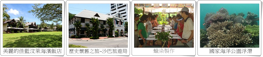 今日我們即將展開沙巴最具代表的紅樹林生態知性之旅,早餐後,帶著雀躍的心情跟隨著導遊前往亞庇市郊擁有美麗沙灘、龐大的紅樹林、豐富的自然生態以及熱情的工作人員~龍尾灣紅樹林樂園。首先我們穿越紅樹林再搭船獨特的馬來竹筏順流而下,沿岸竟是生長茂盛青蔥的紅樹林群,在導遊知性又富趣味的詳細介紹下,保證讓您對紅樹林的維護自然環境和生態的重要性有充分的了解,同時導遊議會請我們大伙將準備好的捕蟳網拋下水,這乃沙巴『巴夭族』原住民捕捉紅蟳魚類的方式,願者上鉤絕不強求與大自然和平相處的生活方式,這種樂天生活方式,值得我們學習。隨後抵達龍尾灣海角樂園,在此我們特別準備了許多極富樂趣、刺激、教育,又好玩的活動準備讓您歡樂一整天。您可結伴在此展開沙灘排球競賽或倆倆一組划著獨木舟深入紅樹林群展開趣味探險;或者可以享受刺激的乘風破浪香蕉船海上巡曳盡情驚叫吧!更要告訴您一種一定要玩的水上活動,那就是『衝浪板』,親自體驗乘風駕浪的帥勁。若您不想尋求刺激活動,放心吧,這裡亦有極富意義的馬來蠟染製做以及咖哩烹飪教學,讓您製作一份專屬的蠟染布紀念品和美味口口的咖哩烹飪方式,保證不會讓您入寶山空手而歸;當然您還可體驗馬來原住民的吹箭活動或拿起釣竿來個釣魚競賽,保證讓您滿足釣魚拉力的快感!午餐樂園更精心安排了馬來傳統鄉村風味料理,讓您可以大啖朵頤一翻(當日入園人數滿20人此餐則以自助餐方式提供;未滿時則以精緻套餐方式提供)。餐後您可於此美麗的海角樂園稍作休息靜靜聆聽風聲、樹聲、海浪聲的多重自然樂團,保證讓您馬上前往周公的家喔!午後園區亦準備了極富風味的馬來抓餅下午茶點,讓您一面欣賞海天一色美景一面品嚐獨特風味抓餅,這就是最大的生活享受吧。午後專車返回飯店好好梳洗並休息一下。晚餐於飯店享用豐盛的晚宴…。〈一般飯店會以自助餐供應,但淡季期間若飯店住房率不高時,有可能改以套餐是供應,敬請各位貴賓知悉〉
