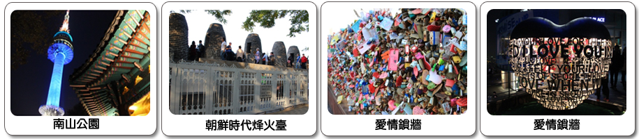 ●【南山公園+N首爾塔(不含快速電梯券)+愛情鎖牆+八角亭+烽火臺】南山海拔265公尺,位於首爾市中心,樹林繁茂,是個非常適合散步的好地方。是首爾的象徵。雖然山不高,但因位在市中心,在山頂可俯瞰周圍的美麗景致,是市民喜歡的休息場所。公園內有著名的八角亭以及朝鮮時代的烽火臺,還有可俯瞰首爾市區的首爾塔,風景非常優美。從1980年開始對大眾開放的首爾塔,不僅是首爾市的象徵,更是眺望首爾市區景觀的最佳去處。在首爾塔全新裝潢後,更是擺脫了老舊的外觀,以嶄新的面貌示人並改名為N 首爾塔有新(NEW)的意思。除了表演、展覽和影像設施,並有高級餐廳、咖啡廳入駐,形成一個複合型的文化旅遊空間,如今的首爾塔是到首爾的遊客必遊的一處景點。還有相愛的情侶來到這兒不能錯過的愛情鎖牆,買一個愛情鎖在上面寫下兩人的名字及誓言鎖在欄杆上,並且許下願望後將鎖匙丟向遠方象徵心愛的兩人感情堅貞,永不分離。