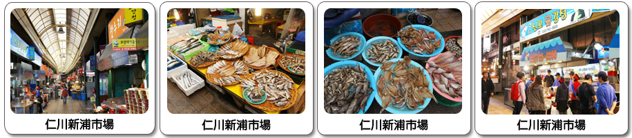 ●【新浦市場】仁川中區新浦洞一帶,佔地3,300㎡的新浦國際市場,據說是從19世紀末開始,日本人、中國人、西洋人等爭相販賣高級蔬菜的地方。透過韓中渡輪(car ferry)與遊輪(Cruise)等船隻,往來仁川的觀光客和國際商人逐年大幅增長,因此與仁川國際客輪站鄰近的新浦市場,漸漸形成多國文化結合的國際市場。目前有140多個攤位入駐,而新浦市場還內有一條著名的小吃街專賣辣炸雞丁(雞肉經過油炸後沾上當地特殊醬料的料理)。市場的知名美食除了辣炸雞丁外,還有糖餅、新浦韓式餃子、山東餃子、新浦血腸等,值得品嚐。