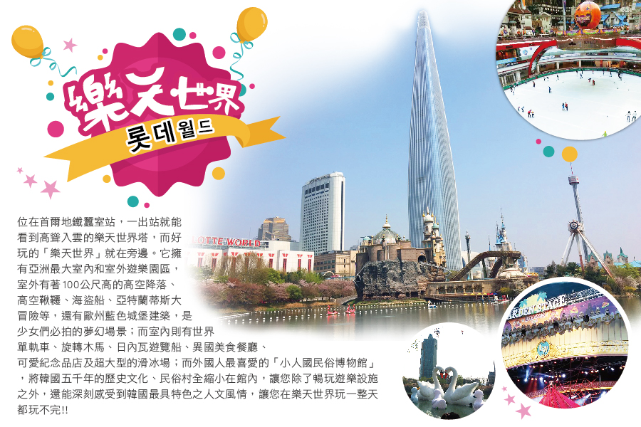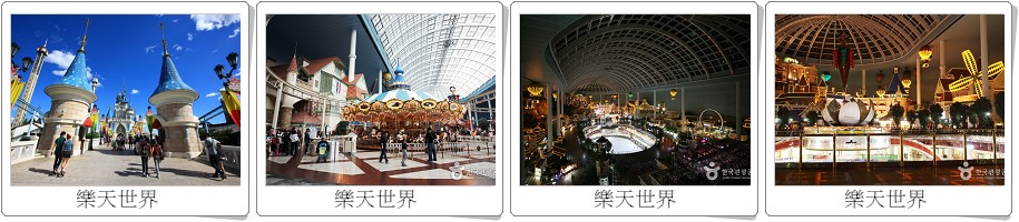 ◎【樂天世界】分室內和室外,室外的『魔幻島』是屬比較刺激的遊樂設施,如100公尺高的高空降落、高空鞦韆、海盜船、亞特蘭蒂斯大冒險等,還可以在浪漫的湖水公園散步。室內的『探險世界』有旋轉木馬、世界單軌車、日內瓦遊覽船、各國風情的街道、各國料理餐廳、紀念品店,還可欣賞精彩的巡遊Show、吉祥物Show及鐳射Show。還可到民俗博物館,這裏是外國人最喜歡去的地方,可以通過歷史展覽館、模型村遊戲場瞭解到韓國五千年的歷史和民俗文化,這裏使用先進的影像設備和微縮模型,會使您的參觀更加輕鬆愉快。打造無拘無束的夢幻世界,適合全家大小一同前來遊玩。在「小人國民俗博物館」裡可以欣賞到像小人國般世界博物館,在此不僅將民俗村以縮小版的製作,並呈獻出最具有特色的韓國文化、風景、生活、人物等景觀模型。