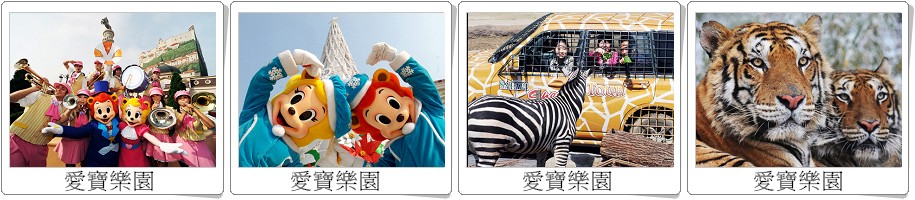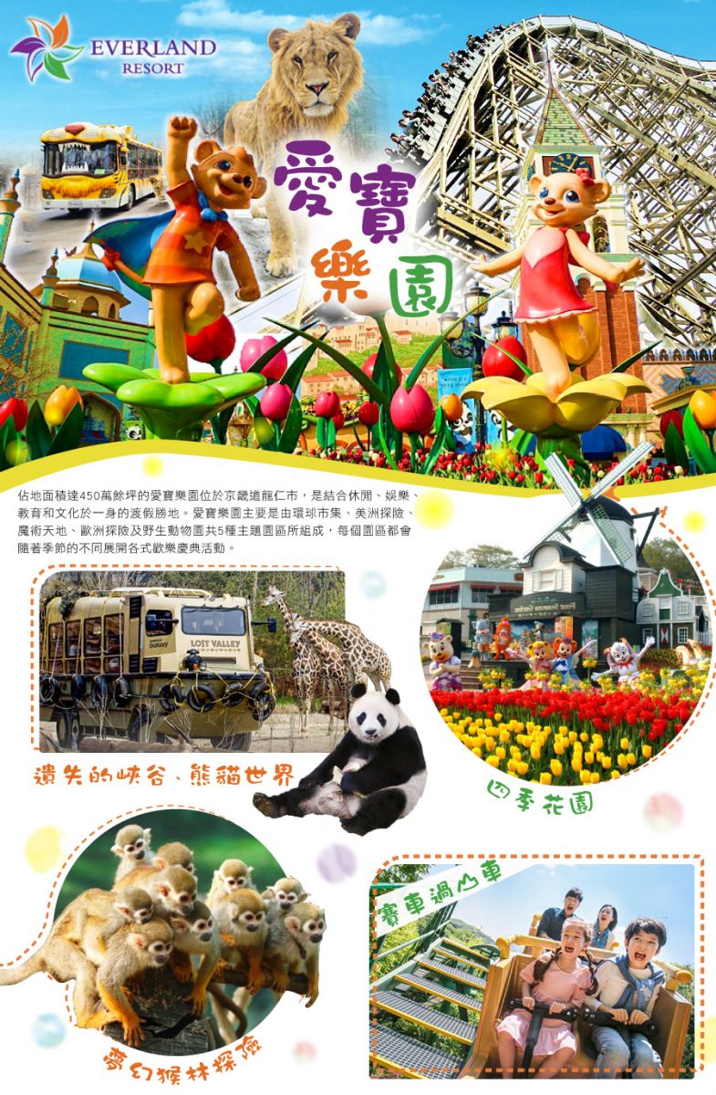 ◎【綜藝“RUNNING MAN”「遊樂園特輯」拍攝地~繽紛愛寶樂園(賽福瑞動物野生世界、四季花園、MONKEY VALLEY夢幻猴林探險+LostVally迷失峽谷+Sky cruise纜車)】佔地面積達450萬餘坪的愛寶樂園,是結合休閒、娛樂、教育和文化於一身的渡假勝地,隨著季節的不同展開各式歡樂慶典活動。這也是劇〝紅豆女之戀〞拍攝地,具有三十年歷史的歡樂世界;在美洲探險地區中有龍捲風、彩虹之旅、天旋地轉、禿鷹要塞、幻想特級、驚魂鯊魚等遊樂設施;在歐洲探險區中有玫瑰花園、野外舞台、宇宙探險、雪橇場、遊樂場等遊樂設施與表演節目;在魔幻世界地區中有挑戰急湍、瘋狂彈簧椅、松鼠遊戲、空中狂舞、海盜船、汽車王國、宇宙戰鬥機等遊樂設施;在伊克托利亞探險-地區中有熊貓、四不像、北極熊、企鵝等珍奇動物及猩猩、紅鶴、海狗、孔雀等的精采表演節目,而地球購物中心能讓您親身體驗到在世界各地購物的快樂,令您仿如置身於奇幻的世界,帶給您終生難忘的回憶。