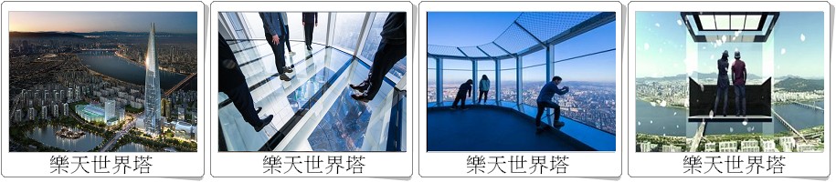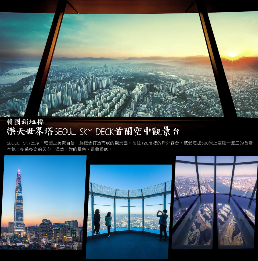 ◎【韓國新地標~樂天世界塔 SEOUL SKY DECK首爾空中觀景台】於2017年4月3日正式開幕。SEOUL SKY位於韓國最高的摩天大樓樂天世界塔的117~123樓,是以「韓國之美與自信」為概念打造而成的觀景臺,具有國際象徵性與韓國傳統美,人與技術、尖端科技與自然環境和諧共存的垂直城市,SEOUL SKY 在此之前即因被列入3 項金氏世界紀錄而蔚為話題。位於118層樓高的SKY DECK 是「世界上最高的透明地板觀景臺」,可體驗在478米高空中地板變透明的神奇體驗,天氣好時還可遠眺仁川松島與西海岸。同時也可拍照收藏這奇蹟的瞬間,將剎那變成永恆。您還可以前往120層樓的戶外露台,感受海拔500米上空獨一無二的首爾空氣,多采多姿的天空,渾然一體的景色,盡收眼底。